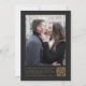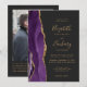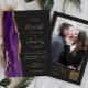 A borda esquerda deste elegante convite de casamento moderno apresenta uma cor d'água roxa, borda agitada, aparada com falso brilho dourado. O texto personalizável combina manuscrito dourado, fontes em copperplate e itálico em um fundo de cinza de carvão escuro. Adicione sua foto favorita ao verso, juntamente com texto adicional e um código QR para enviar convidados para o site do seu casamento.