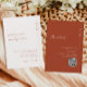 Mínimo e clássico terracotta boho QR code convite de casamento com linhas limpas, tipografia elegante e número moderno de casamento no topo.