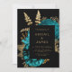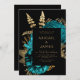 Este elegante e modesto convite para o casamento apresenta um buquê floral romântico e exuberante em turquesa com folha de ouro e folhagem brilhante num fundo negro. Personalize o texto dourado em fontes na moda em um retângulo preto. O verso fornece espaço para detalhes do casamento em um fundo preto sólido, junto com um código QR que os convidados podem digitalizar para visitar seu site e RSVP, o que economiza o custo de imprimir e enviar cartões RSVP separados.