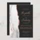 A borda esquerda deste elegante convite de casamento moderno apresenta uma cinza e uma aquarela branca, aparada com falso brilho de rosa. O texto personalizável combina letra rosa, letra copperplate e itálico em um fundo preto de ardósia. O verso fornece espaço para detalhes do casamento em um fundo de slate sólido, junto com um código QR que os convidados podem digitalizar para visitar seu site e RSVP, o que economiza o custo de imprimir e enviar cartões RSVP separados.