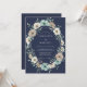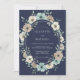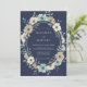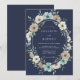 Este design apresenta um encantador arranjo circular de flores macias e folhagem delicada em tons suaves de azul, creme e rosa. Os elementos botânicos evocam uma atmosfera suave e romântica, perfeita para uma celebração elegante. A impressão geral é de beleza natural refinada.