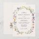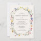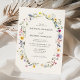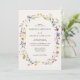 Convites florais elegantes com detalhes de seu casamento cercados por um quadro oval de flores silvestres e folhagem em tons de rosa, amarelo, roxo, azul e verde com fundo creme. Os convites ao contrário mostram um buquê colorido de flores silvestres e verde. Os convites para casamento de flor selvagem rústica são perfeitos para casamentos de primavera e verão.