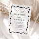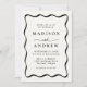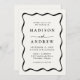 Apresentamos o convite para o casamento do Modern Black Wavy Frame, onde boho se encontra com o Retro numa celebração harmoniosa do amor! Com as letras negras dançando sobre o fundo esbranquiçado, enfeitado com um quadro ondulado que lembra o charme vintage, este design cômico define o tom perfeito para seu dia especial. Personalizado com os nomes dos casais e os detalhes do casamento, cada elemento exumenta um ar de nostalgia e elegância moderna. Aceite o encantamento de sua união com este convite único, convidando seus convidados a se juntar à alegria de sua história de amor boho-retrô.