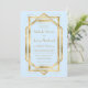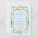 Este elegante convite de casamento inspirado em vintage apresenta texto dourado num fundo azul pastel de bebê, enquadrado por um design de arte de vintage geométrica. Um padrão de ventilador de deco de arte azul e ouro coordenador decora a parte de trás da carta.