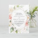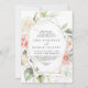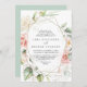 Este convite de casamento floral de folhagem de ouro geométrico é perfeito para um casamento rústico. O design apresenta uma folhagem botânica, pintada à mão, verde e dourada, com flores cor-de-rosa, pinceladas, brancas, enfeitando uma elegante estrutura geométrica.