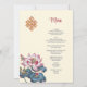 Este cartão de cardápio tibetano apresenta um símbolo tradicional de nó sem fim e flores de lótus num estilo artístico tibetano/asiático contra um fundo creme moderno.