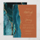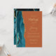 A borda esquerda deste elegante convite de casamento moderno apresenta uma coloração aquosa lacrimogênea aparada com uma falsa brilha de ouro. O texto personalizável combina manuscrito dourado, fontes em copperplate e itálico em um fundo laranja queimado. O verso apresenta um design de chaleira e de agata dourada.