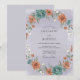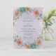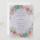 Este design encantador apresenta um arranjo pintado de flores exuberantes e macias e folhagens delicadas. Uma bela grinalda artística de flores em tons de coral e flores em azul-teal adorna a periferia, criando uma atmosfera romântica e caprichosa para o seu dia especial.