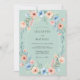 Um delicado arranjo de flores de pêssego macio e azul suave adorna este cenário de salvia suave. Um verde exuberante envolve os elementos florais, criando uma atmosfera suave e aérea perfeita para uma celebração romântica. Este design pictórico evoca uma sensação de elegância discreta.