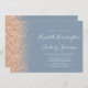 A borda esquerda deste elegante convite de casamento moderno apresenta uma borda falsa de pêssego. O texto personalizável combina manuscrito branco, fontes em copperplate e itálico em um fundo azul empoeirado. O verso apresenta um design de brilho azul empoeirado e cor de pêssego.