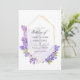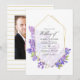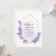 Convite de casamento floral violeta - lilás aquarela com uma moldura geométrica de herbário dourado personalizável para os detalhes do seu evento. Ideal para qualquer tema ou casamento de jardim. A foto no verso é opcional. Se preferir removê-la, role até o final de "Personalize este modelo" e clique em "Editar Usando a Ferramenta de Design". Na Ferramenta de Design você pode editar, dimensionar, excluir ou mover qualquer texto ou elemento de design que desejar.