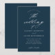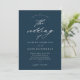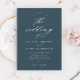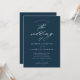 Um convite de casamento azul-marinho simples e elegante com detalhes de caligrafia em letra cursiva e texto clássico. Clique no botão de edição para personalizar este design.