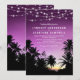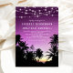 Convites de casamento de destino de praia com palmeiras tropicais de verão, um pôr do sol roxo romântico e um modelo de texto de casamento moderno.