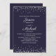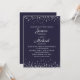 Convite de casamento moderno e elegante em azul marinho com brilho prateado e letra cursiva.