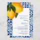 Limões e azulejos mediterrâneos azuis são a base deste design de casamento personalizado na moda. Azul, amarelo e verde. Inspirando um tema brilhante de verão. Mude facilmente as informações para o seu design de casamento personalizado.