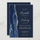 A borda esquerda deste elegante convite de casamento moderno apresenta um marinho azul de aquarela agata bordada com falso brilho prateado. O texto personalizável combina escrita manual, impressão e fontes itálicas em cinzas prateadas em um fundo azul marinho. O verso fornece espaço para detalhes do casamento em um fundo azul de marinho sólido, junto com um código QR que os convidados podem digitalizar para visitar seu site e RSVP, o que economiza o custo de imprimir e enviar cartões RSVP separados.