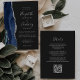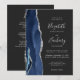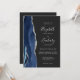 A borda esquerda deste elegante convite de casamento moderno apresenta um marinho azul de aquarela agata bordada com falso brilho prateado. O texto personalizável combina manuscritos, placas de impressão e fontes itálicas em cinzas prateadas claras em um fundo de cinza de carvão negro. O verso fornece espaço para detalhes do casamento em um fundo sólido fora do preto, junto com um código QR que os convidados podem digitalizar para visitar seu site e RSVP, o que economiza o custo de imprimir e enviar cartões RSVP separados.