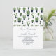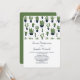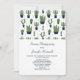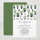 Convite de casamento com um monte de cactos verdes fofos em um padrão repetitivo. Estes cactos são coloridos de verde e sentados em um vaso de flores azul escuro. Pequenos triângulos decorativos entre as imagens.