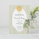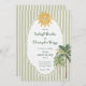 Este convite de casamento caprichoso na costa apresenta um motivo de sol vintage, borda de renda, palmeira e fundo listrado de verde sálvia elegante. Perfeito para um casamento na praia ou destino na Califórnia. Criado por Simply Farmhouse Press.