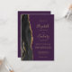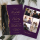 A borda esquerda deste elegante convite de casamento moderno apresenta uma coloração aquosa preta, borda agitada, aparada com falso brilho dourado. O texto personalizável combina manuscrito dourado, fontes em copperplate e itálico em um fundo roxo. O verso fornece espaços para 5 fotos (3 horizontais 1 quadrado e 1 vertical) e espaço para o seu site de casamento URL ou outra mensagem breve.