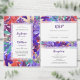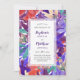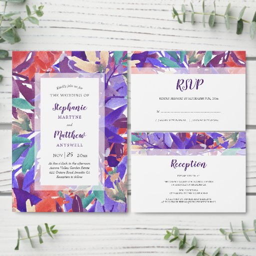 Estes convites para o casamento apresentam um padrão pintado de aquarela moderna com coral, púrpura e verde e flores. Há um monograma atrás. Personalize-os com o seu próprio texto. Estes convites fazem parte de uma coleção de suítes de casamento que inclui um cheio de papelaria de casamento correspondente. Visite nossa loja ou veja nossas páginas de coleta para ver o intervalo de cheios.