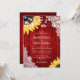 Convite de casamento russo vermelho apresentando girassóis contra um fundo de madeira de celeiro adornado com rendas florais brancas e luzes de cordas. Design de cartão perfeito para convidar seus hóspedes para o seu país rústico vermelho, quintal ou festa de casamento de celeiro inspirado pelas flores de girassol.