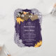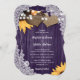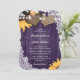 Convite de casamento floral roxo com girassóis e corações de burlap contra um fundo de madeira de celeiro adornado com rendas florais brancas e luzes de cordas. Design de cartão perfeito para convidar seus hóspedes para seu país rústico, jardim, quintal ou festa de casamento de celeiro roxo inspirado por flores de girassol.