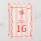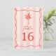 Ilustração de palmeira de arte em linha vermelha sobre fundo de faixa rosa com texto vermelho e moldura ondulada desenhada à mão.