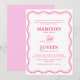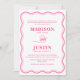 Este Convite Retro Onda Cor-de-Rosa Traz uma vibração nostálgica, mas contemporânea, com as suas curvas lúdicas e sotaques. A caligrafia desenhada à mão, combinada com um esquema ousado cor-de-rosa e vermelho, adiciona um toque de retro na moda à sua papelaria de casamento. Perfeito para casais que amam o charme vintage, este design de convite ondulado captura a essência de um casamento retrô com uma reviravolta moderna.