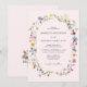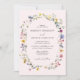 Convites florais elegantes com detalhes de seu casamento cercados por um quadro oval de flores silvestres e folhagem de cor d'água em tons de rosa, amarelo, roxo, azul e verde com um fundo rosado. Os convites ao contrário mostram um buquê colorido de flores silvestres e verde. Os convites para casamento de flor selvagem rústica são perfeitos para casamentos de primavera e verão.