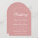 Um convite para casamento simples e minimalista. Tem apenas texto branco sobre fundo cor-de-rosa rosa empoeirado. A palavra Casamento e os nomes são escritos em um roteiro caligráfico elegante. Acima da palavra Casamento há um texto arquivado.