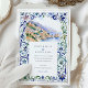 Traga seus convidados para as margens ensolaradas de Itália com este convite de casamento. Perfeitamente adequado para um casamento de destino, este design apresenta uma ilustração impressionante da aquarela de uma aldeia pitoresca de Amalfi, com edifícios charmosos a escorrer penhascos para se encontrar com o mar azul sereno. A cena é maravilhosamente enquadrada por uma intrincada fronteira inspirada pelos tradicionais azulejos italianos Majolica. Envolventes de aquarela deliciosos, pintados à mão em tons de azul clássico, verde-sábio e amarelo-mudo criam um quadro elegante e artístico. Combinar o panorama cênico e o padrão do azulejo do ornamentado evoca uma sensação de romance europeu eterno. Seus detalhes de casamento são apresentados em um sofisticado emparelhamento de fontes clássicas de serifa e escrita graciosa, completando este design verdadeiramente especial.