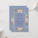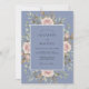Este design apresenta um cenário azul pervinca sereno adornado com rosas cor-de-rosa desbotadas pintadas e botões delicados. Folhas caprichosas de eucalipto e folhagens dourado-tan fornecem um sentimento exuberante e orgânico para a estética geral. As texturas de aquarela criam uma atmosfera romântica e atemporal perfeita para um evento de primavera ou verão.