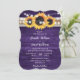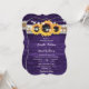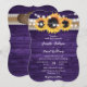 Convite para casamento russo de roxo e girassol com girassóis e lanternas contra um fundo de madeira rústica adornado com fita de arromba e rendas. Dois corações de burlap nas costas. Personalize facilmente este cartão de casamento floral roxo com os seus detalhes de casamento.