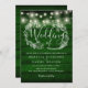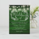 Um convite de casamento rústico com luzes bonito de cordas e uma delicada garland floral rústica desenhada à mão de folhagem botânica com tipografia de na moda, num fundo de madeira verde-esmeralda rústica. Personalize com sua informação especial do dia do casamento. Projetado por Thisnotme©