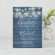 Um convite de casamento na moda rústico com luzes bonito de cordas, nomes de estilo de assinatura e tipografia quic num fundo azul de madeira rústica. Projetado por Thisnotme©