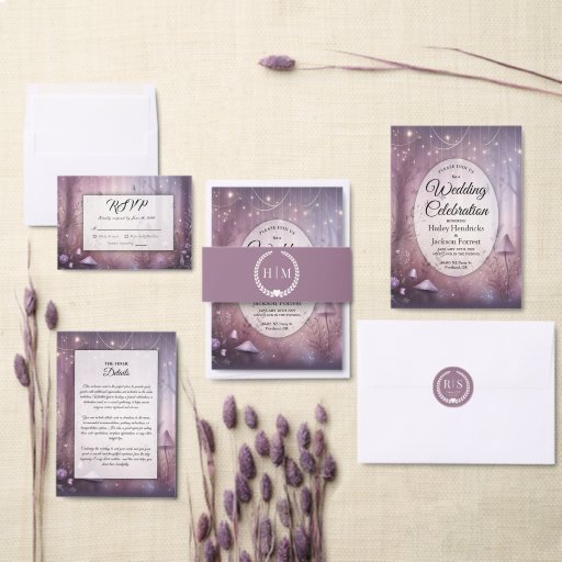 Entra numa noite encantada com este convite de casamento da Lavanda Mágica Fairy Lights. Máscaras de lavanda e brilho reluzente contra um pano de fundo místico da floresta, onde luzes de fadas cintilantes, borboletas delicadas e flores brancas criam um hetero de cena de um conto de fadas. Romântico e etéreo, este design dá o tom para uma celebração cheia de maravilha e magia. Perfeito para casais que querem seu dia especial para se sentirem eternos, sonhos e inesquecíveis.