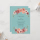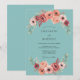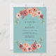 Um deslumbrante design em aquarela apresenta arranjos exuberantes de peônias cor de pêssego e anêmonas bordô contra um cenário turquesa tranquilo. O estilo pictórico evoca uma atmosfera romântica e caprichosa perfeita para um evento de primavera ou verão. Folhagens suaves e delicadas complementam as flores vibrantes, criando um visual equilibrado e artístico para um tema inspirado na natureza.