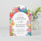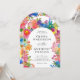 O design do convite para o casamento é elegante e vibrante, apresentando uma alegre borda floral de aquarela que adiciona calor e charme enquanto enquadra o texto lindamente. A tipografia combina uma fonte sofisticada de serifa para os nomes com um roteiro delicado para "E", criando o interesse visual. O alinhamento central do texto garante uma aparência limpa e formal, fazer os detalhes facilmente lidos. Os tons pastel e floral brilhantes complementam o tema romântico, acrescentando um toque festivo e vivo.