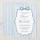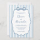 Este convite de casamento azul empoeirado e branco apresenta uma moldura rendilhada desenhada à mão com um arco em um fundo de listras de aquarela e caligrafia manuscrita.