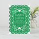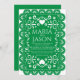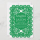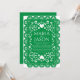 Este design de Convite para Arte do Papel Branco Picado Verde Mexicano apresenta um quadro verde decorativo simétrico inspirado em padrões picado ou recortados de rendas, frequentemente vistos em cenários festivos ou folclóricos. Motoses brancas cortadas de corações, flores e espirros embelezam a fronteira, criando um sentimento elegante e romântico. As bordas recortadas são adornadas com formas semelhantes às pétalas repetidas e pontilhadas, fazer o design perfeito para convites, cartões de saudação ou anúncios festivos com um charme artesanal.