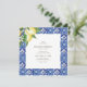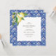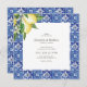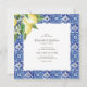 Composto por tipografia serif e escrita cursiva. Tudo contra um pano de fundo de aquarela de azulejos espanhóis mediterrânicos azuis e brancos com folhas de folhagem verde, limões e botânicos florais selvagens. Este foi projetado pelo White Paper Birch Co., exclusivo para Zazzle. Disponível aqui: http://www.zazzle.com/store/whitepaperbirch