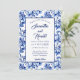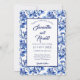 Um convite de casamento com um elegante design de toile floral azul e branco.