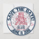 Cartões de convite redondos com tema de casamento de beisebol. Este é personalizado para um cliente específico. A frente do cartão é uma moldura/inserção de foto. Anéis azuis interno e externo com uma foto personalizada no centro. Círculos de texto em vidro decorativo na parte superior e diz: SALVE A DATA. Mais círculos de texto em vidro na parte inferior e mostra a data do casamento dos clientes. Este texto está em ambos os lados do cartão. O fundo da borda externa é de listras azuis e brancas de beisebol. No verso do cartão, você tem o mesmo texto na parte superior e inferior em um fundo listrado. Pequenos enfeites de coração vermelho estão entre as palavras. O fundo do centro é branco sólido com bolas de beisebol espalhadas por toda parte. O texto decorativo em vidro diz: Mathew Howard e Sylvia Newcomb estão subindo para o home plate e apostando 1000 que seu amor vai durar para sempre. As equipes se fundirão em uma em 11 de junho de 2016. Os convites de casamento com tema de be