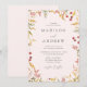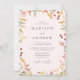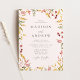 Convites de casamento de flores silvestres elegantes com seus nomes e detalhes de casamento exibidos em letras verdes cercados por um quadro de flores e folhagem em tons de amarelo ouro, rosa e roxo. Os convites para flores silvestres de aquarela são perfeitos para casamentos de primavera e verão.
