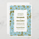 Perfeito para aquele casal de espírito livre com planos para um caso pequeno e boêmico, este convite para o casamento apresenta uma borda floral de flores soltas e groovy no azul de ovo Robin com centros amarelos de mostarda, acentuados por pequenas flores verdes de azeitona para preencher o espaço extra. Esta design tem alguns desses anos setenta, vibrações hippiedosas, enquanto também atrai o moderno e colorido amante do padrão e do maximalismo. O texto simples e fácil de editar está pronto para ser usado com texto e texto ocasionais para um rsvp digital no verso com um fazer de código QR personalizado digitalizável. Este é um design compatível com orçamento também. As fontes e as cores de todas as partes do design são fáceis de alterar usando o botão azul "editar design" e as opções de menu de ferramentas de seleção de cores dentro de design.