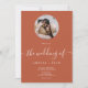 Simples e elegante boho terracotta White photoscript convite de casamento com esta caligrafia clássica e elegante o casamento de Script em terracotta Earth tone e branco. Adicione sua foto de casal em uma máscara circular.