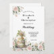 Um único e belo bolo de casamento e uma floral cor-de-rosa com convite de casamento verde.