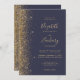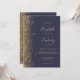 A borda esquerda deste elegante convite de casamento moderno apresenta um design dourado falso. O texto personalizável combina manuscrito colorido de ouro pálido, fontes copperplate e itálico em um fundo azul escuro. O verso apresenta um design de brilho azul escuro e dourado.