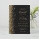 A borda esquerda deste elegante convite de casamento moderno apresenta um design dourado falso. O texto personalizável combina manuscrito colorido de ouro pálido, fontes copperplate e itálico em um fundo preto. O verso apresenta um design de brilho preto e dourado correspondente.